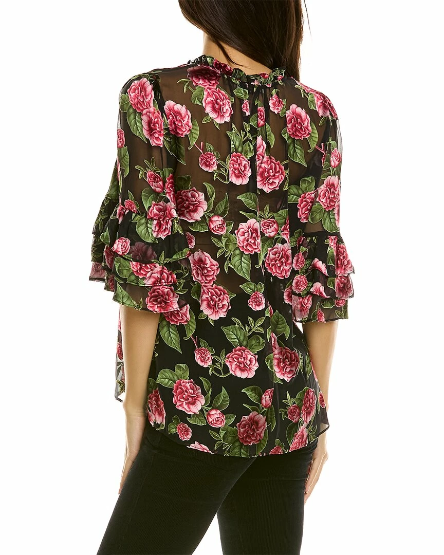 - Julius Silk-Blend Tunic Top In Cheri Floral With Satin Burnout Design And Elbow-Length Tiered Bell Sleeves