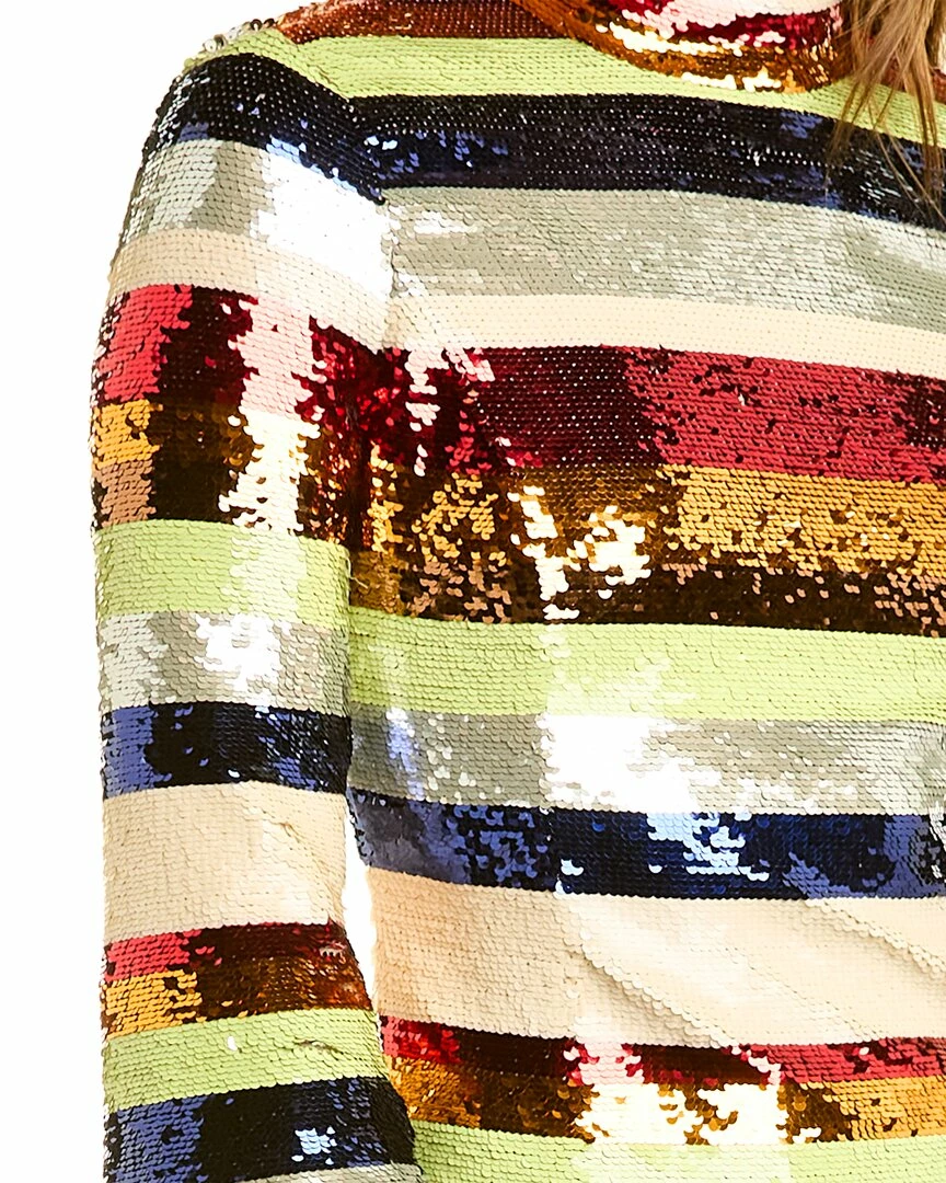 - Mailynn Sequin Mini Dress In Multicolor Stripe With Trumpet Sleeves, Mock Neck, And Open Back