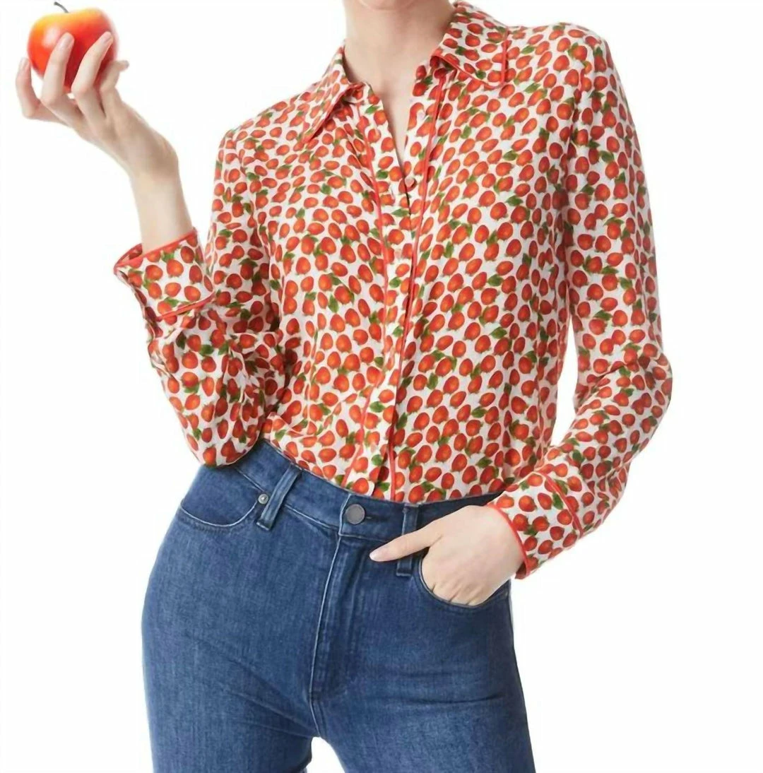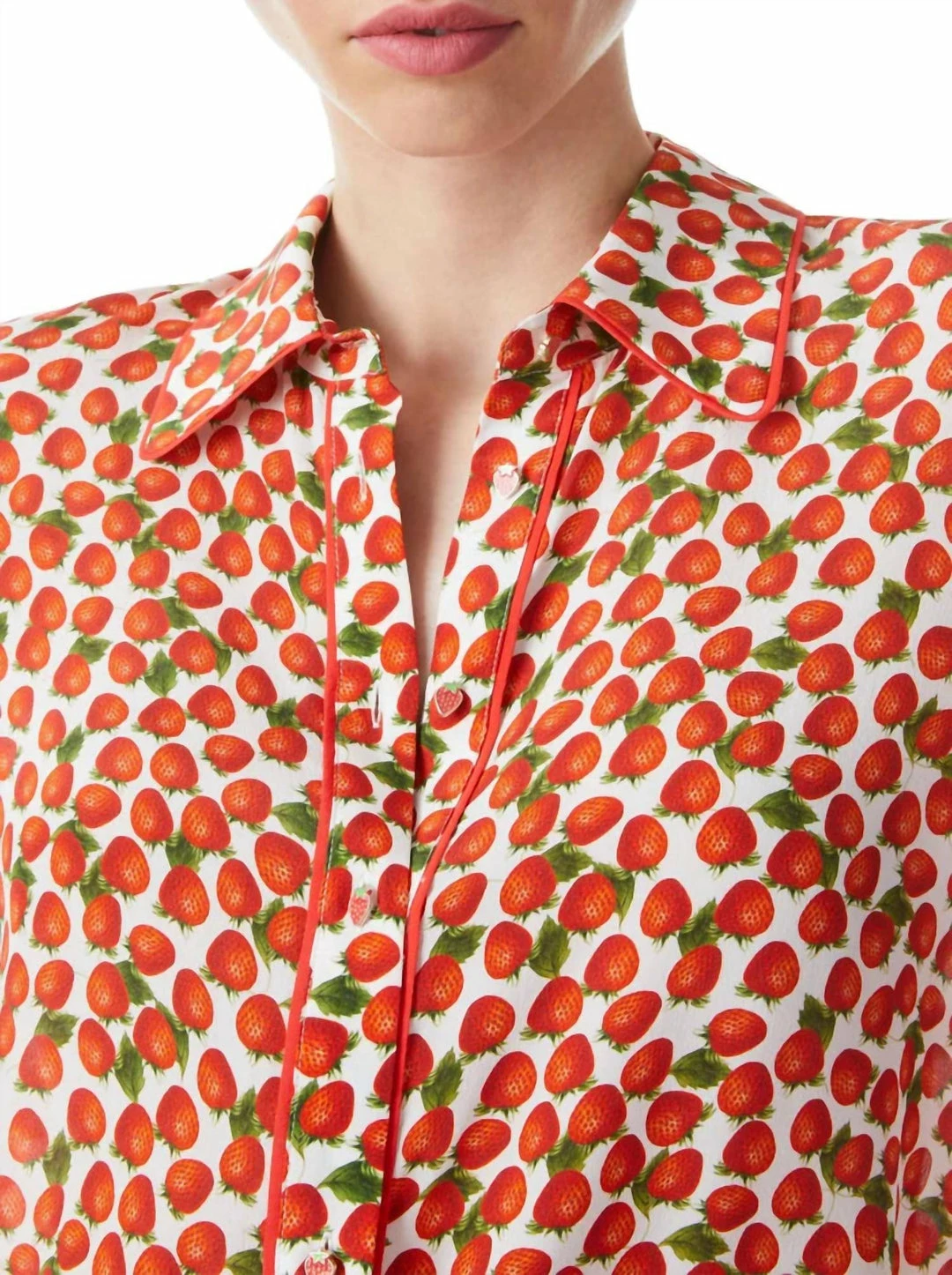 Our signature feminine button-down, in our strawberry print. This is the shirt we can’t get enough of with a relaxed, flattering fit that works any time you need to look like the boss you are.Size – XSSpread collarLong sleeves with double-strawberry-button cuffsFront strawberry-button placketBack yoke with box pleat detailAllover strawberry print with solid piped trimImportedDry Clean